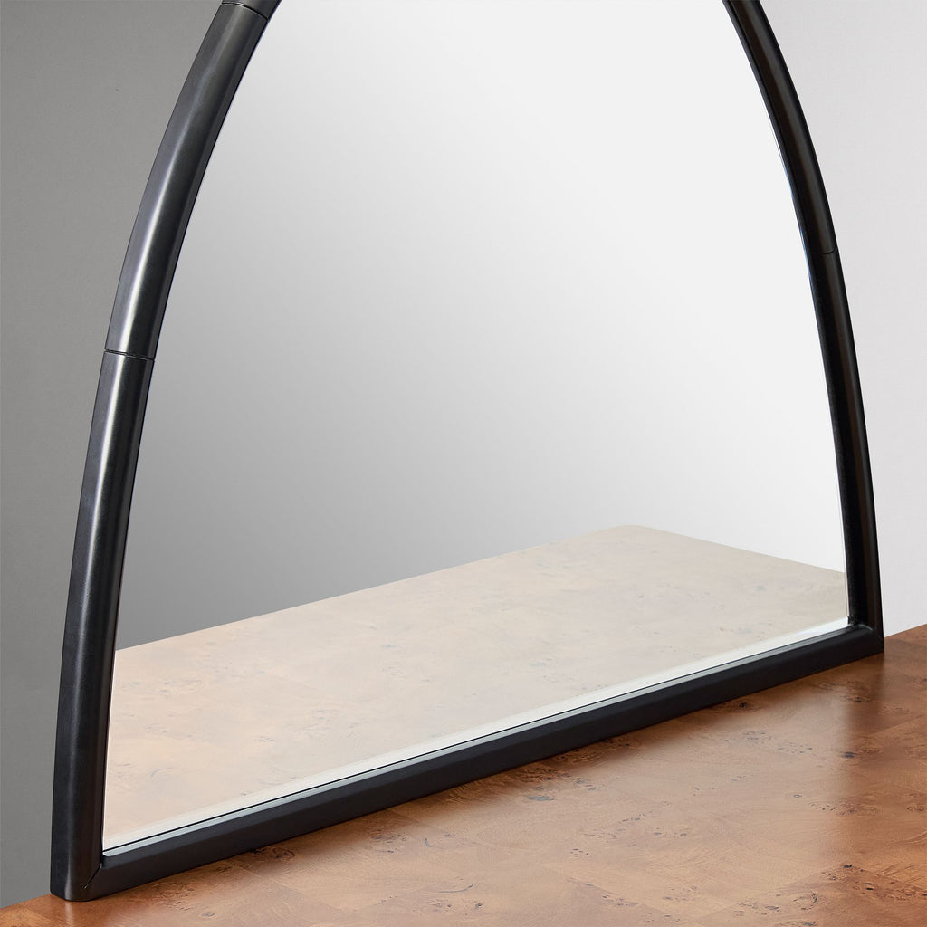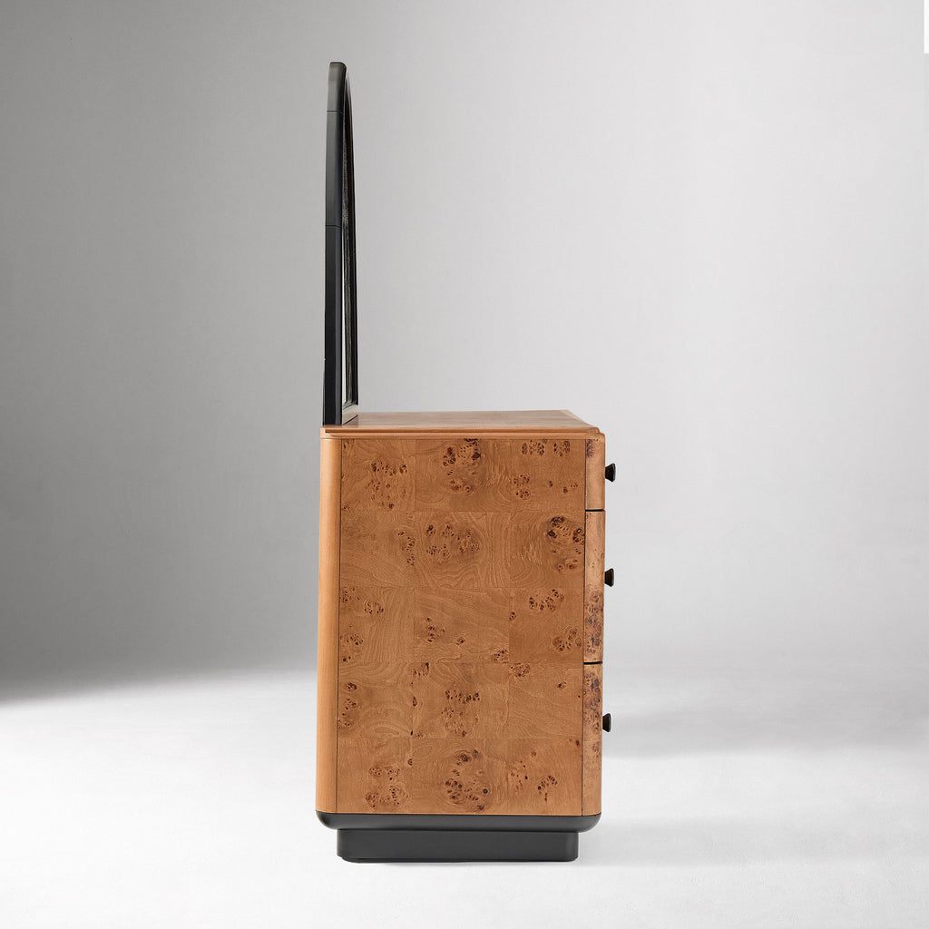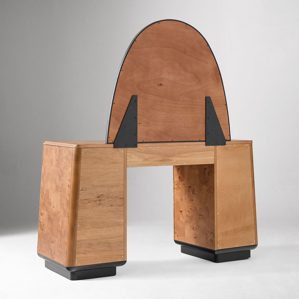 The Pierce & Ward Burl Wood Vanity combines vintage charm with modern elegance, featuring beautifully curved shapes and a tapered pedestal base. Crafted with contract-grade durability, it suits both makeup routines and work tasks. Its striking burl veneer showcases unique swirl grain patterns, adding a luxurious touch to any space. This limited-edition piece blends artful living with lasting quality, making it a refined addition to your home.