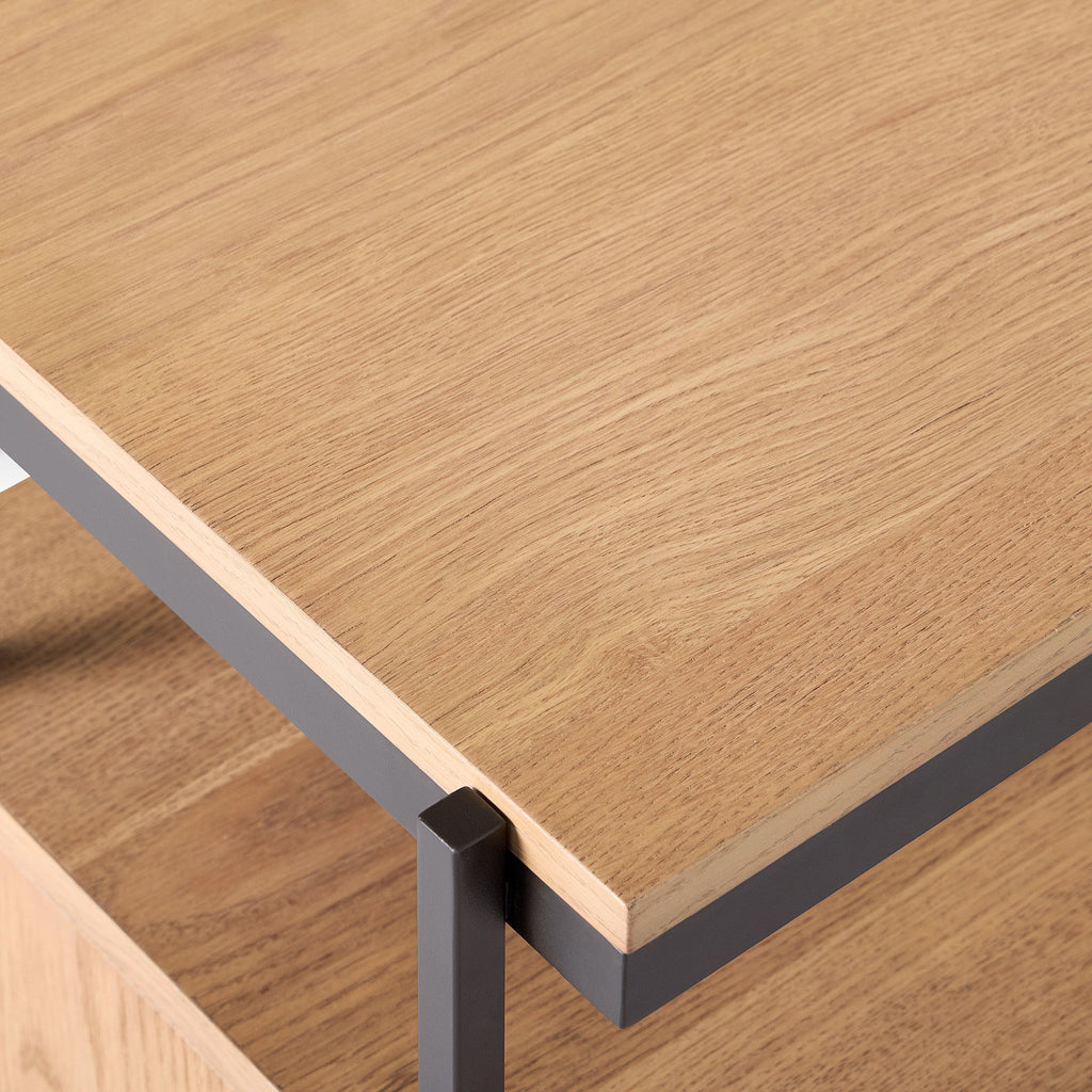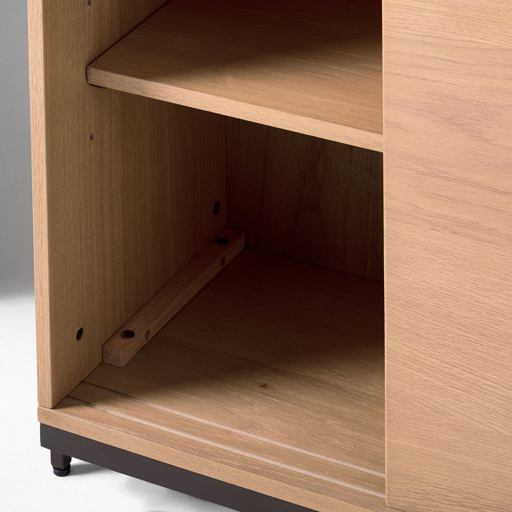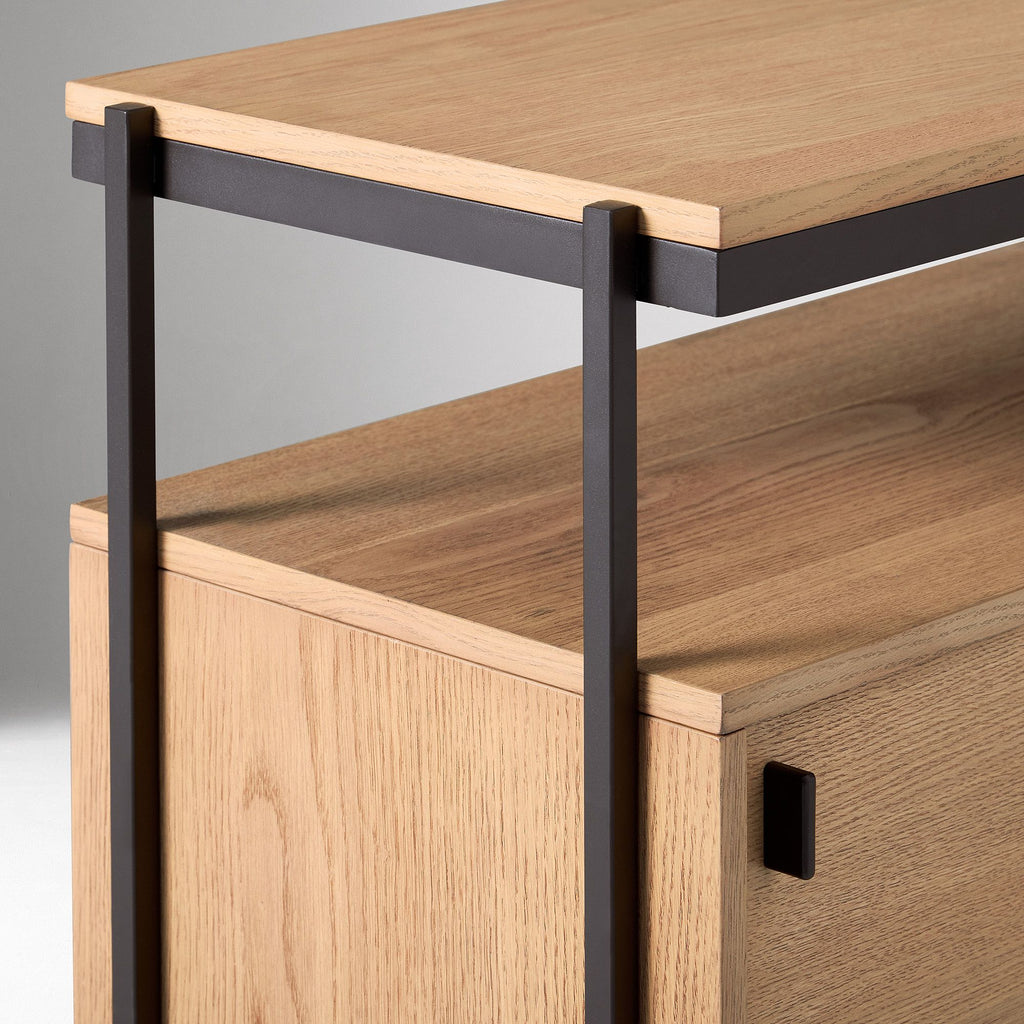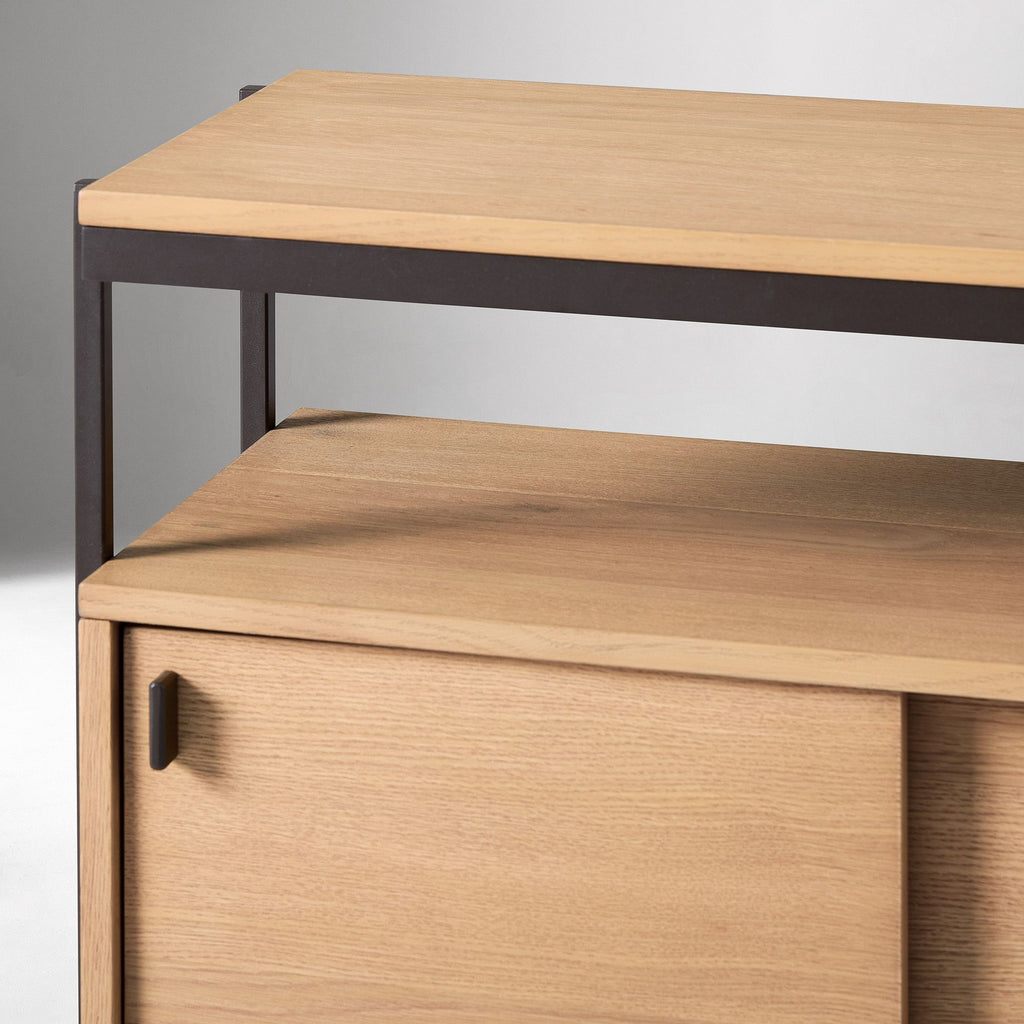 MATERIALS: Engineered wood top covered with an oak and mindi veneer. Mild steel frame and legs. Engineered wood sides, shelves and doors. Aluminum cabinet door handles.