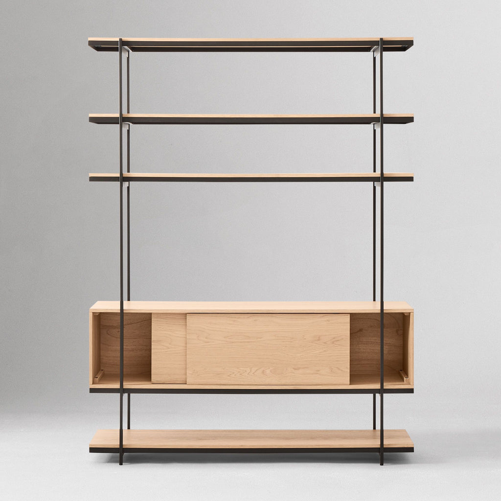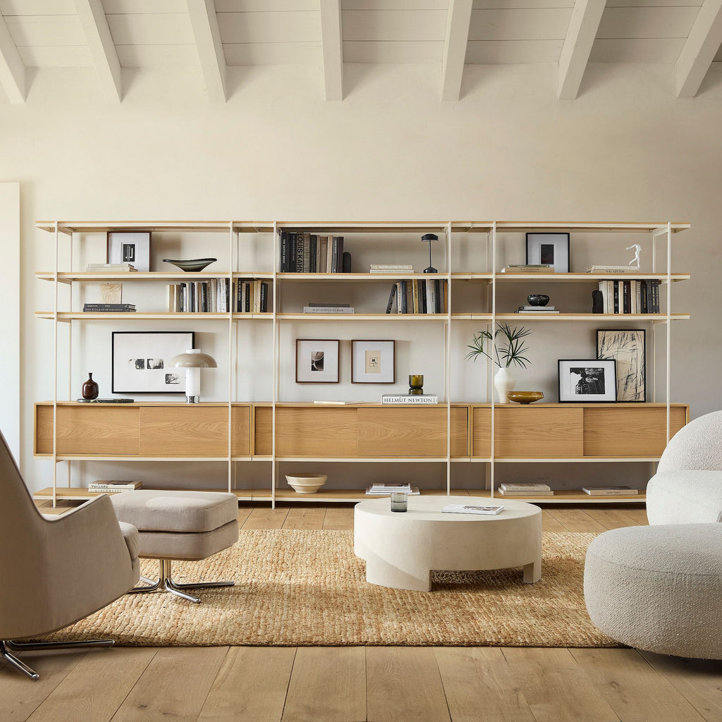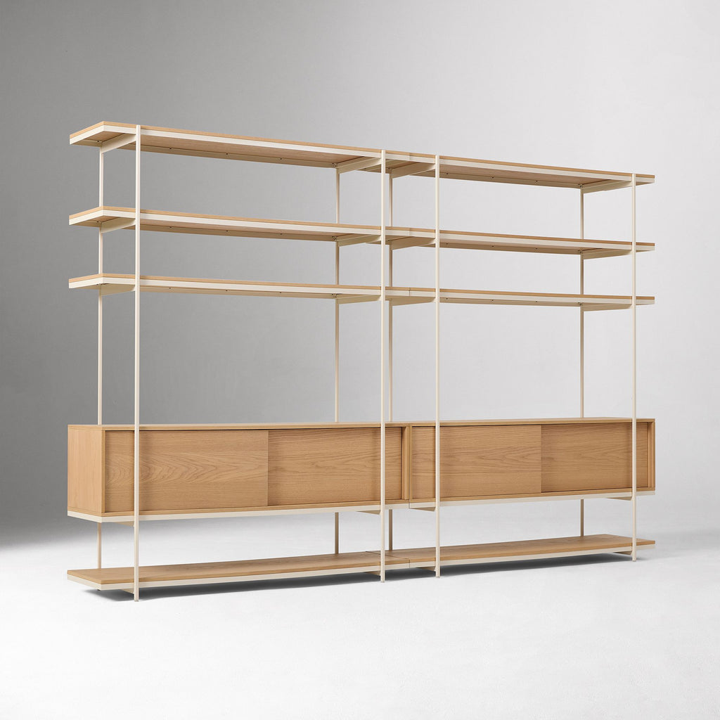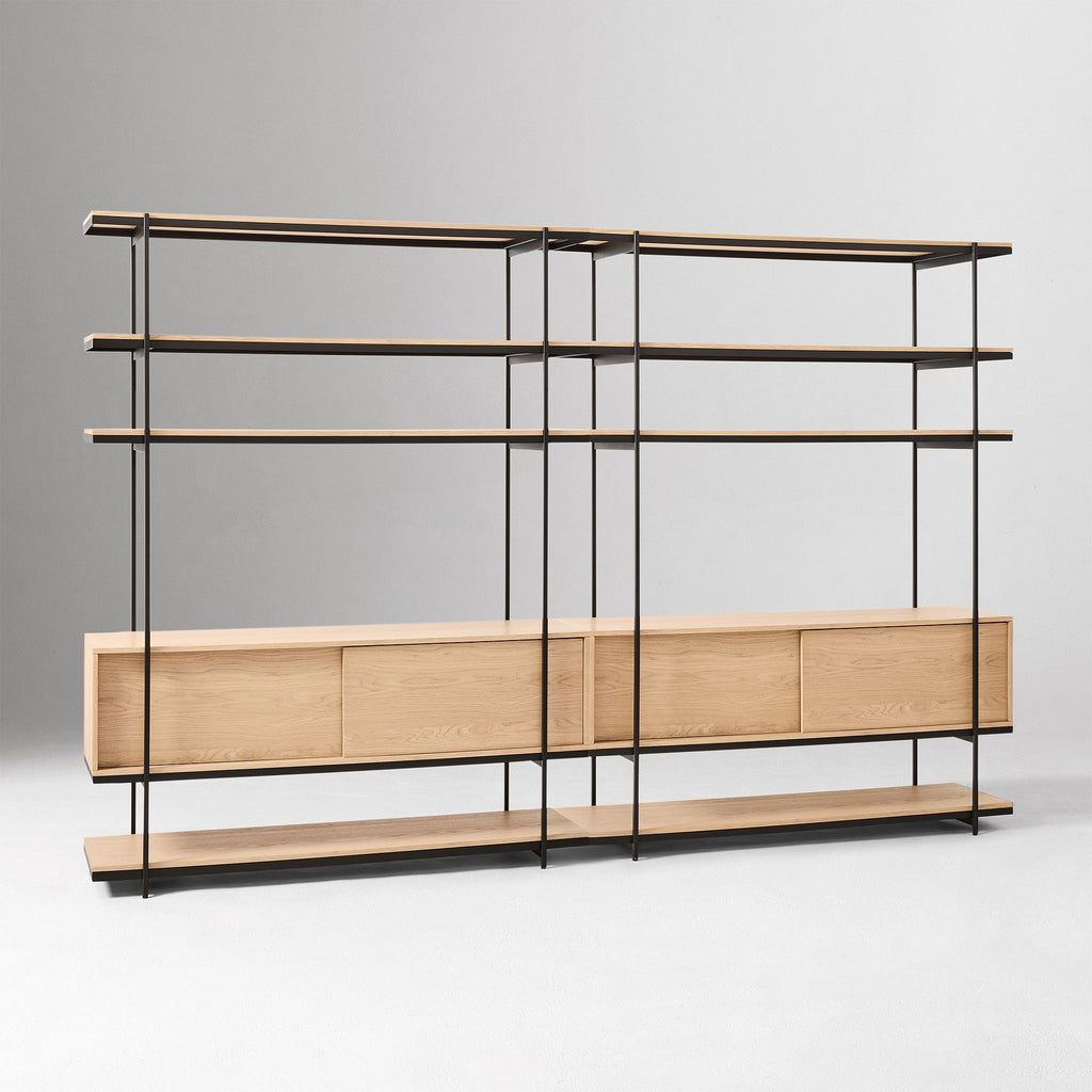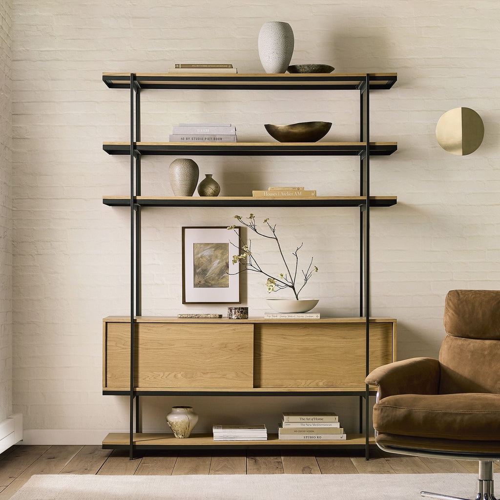 The PIERCE WIDE STORAGE SHELF UNIT brings understated Scandinavian elegance to any room. Crafted from kiln-dried wood and built to contract-grade standards, this shelving system combines durability with refined design. Choose from five versatile sizes to customize your storage solution, then select either sleek Black-finished metal for striking contrast or soft Putty for a cohesive aesthetic. Perfect for those who appreciate quality craftsmanship and timeless style.