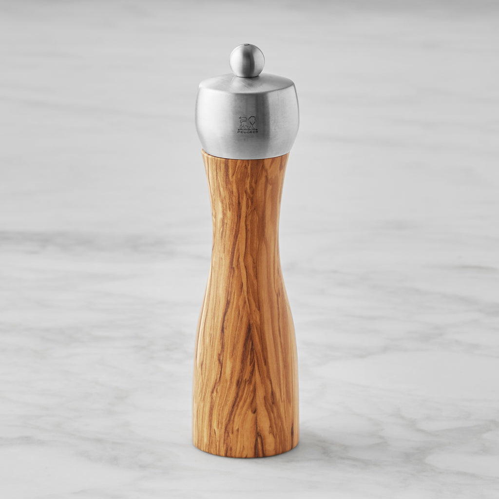 MATERIALS: Crafted of olivewood with a velvety feel. Brushed stainless-steel head screws off for easy filling.