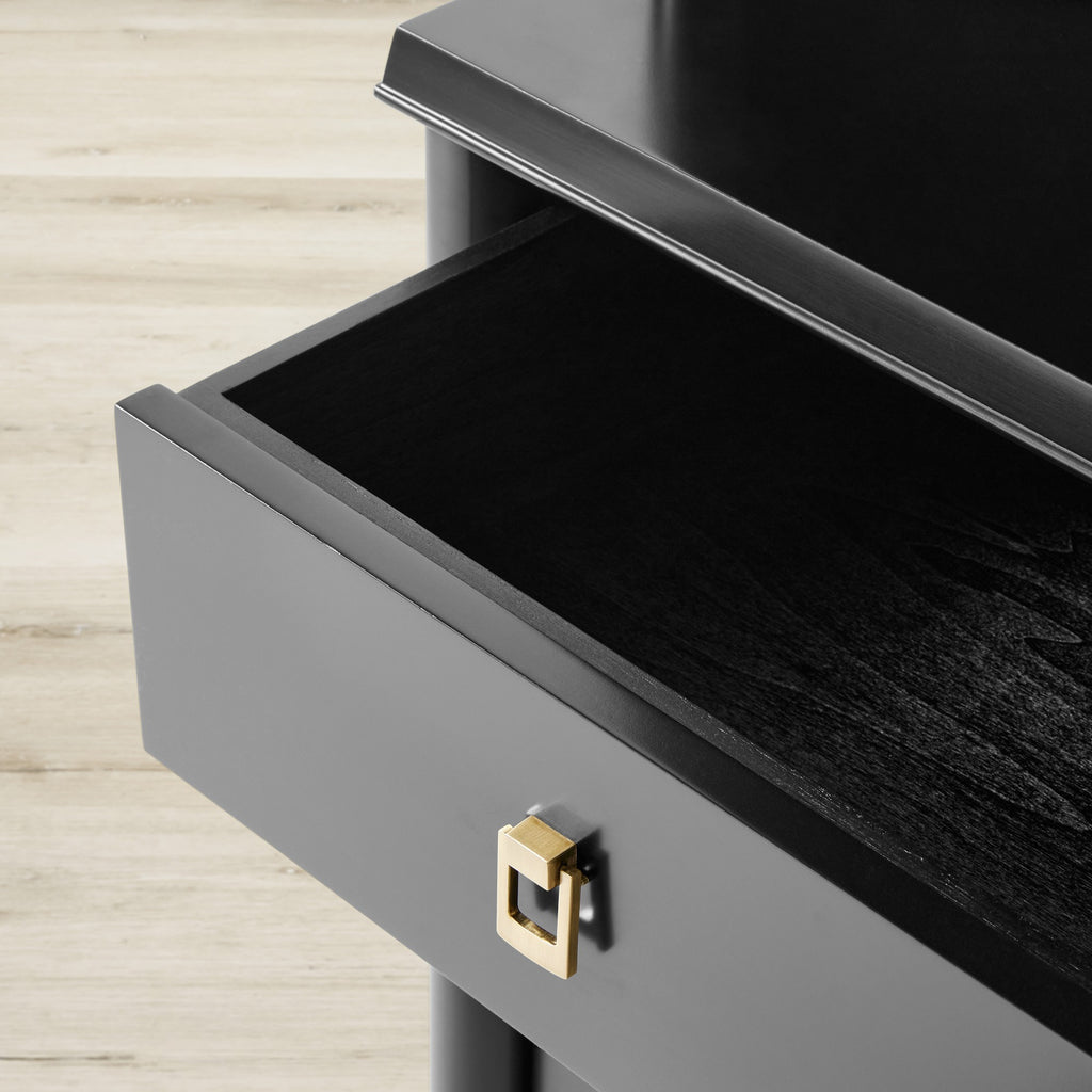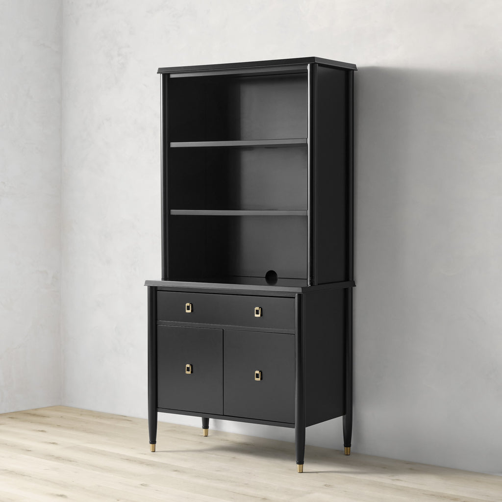 Inspired by the refined aesthetics of 1940s French design, the LACOURTE STORAGE HUTCH commands attention with bold, architectural presence. This two-piece modular system pairs an open-shelving hutch top with a substantial base cabinet, delivering storage that refuses to whisper. Hand-finished ebony lacquer with a semi-gloss sheen creates depth and drama, while antique brass drawer pulls inject vintage edge. Dovetail joinery ensures the spacious drawer withstands years of bold living. A statement piece for those who view storage as an opportunity to showcase impeccable taste and fearless style.