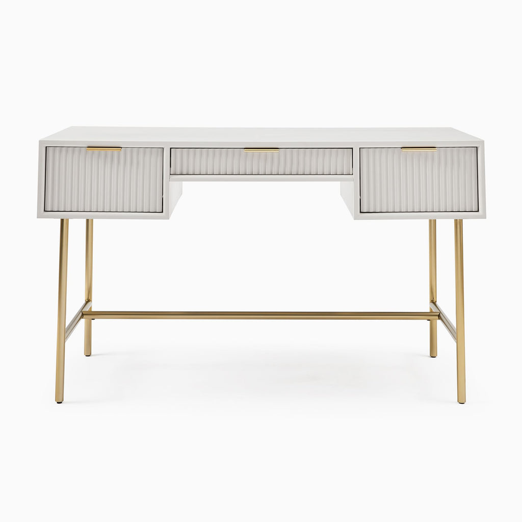 Make an elegant statement with the QUINN DESK, a smaller version of the QUINN EXECUTIVE DESK with the same chic design that doesn't take up much space. Constructed with sturdy mahogany wood in a water based finish, its three drawers provide ample storage for stationery, pens, and notebooks, while its textured detail and glamorous bright hue make it a timeless accent piece. Metal legs provide stability and durability to this piece, sure to be an enduring part of your home.
