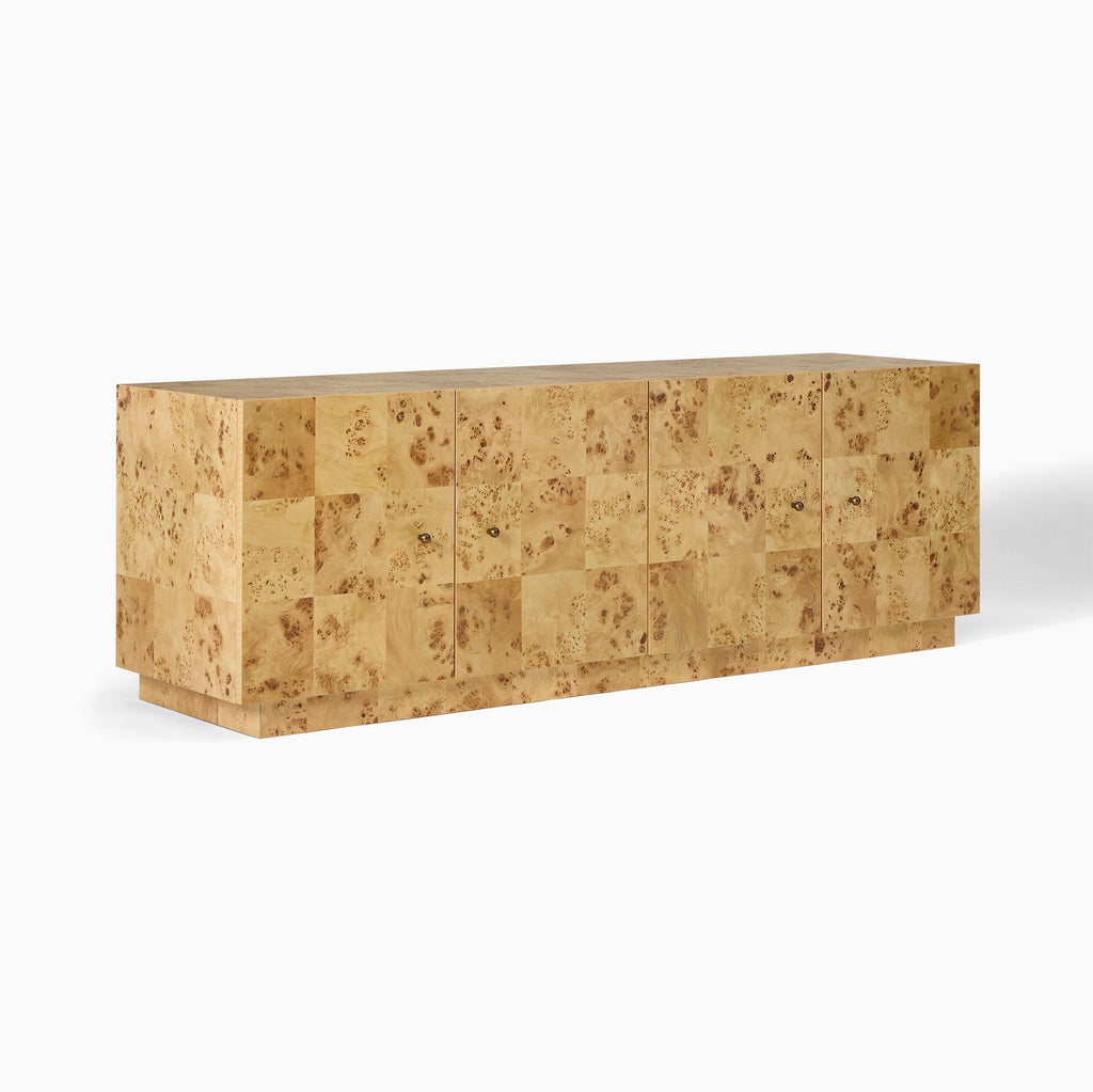 This striking media console showcases exquisite burl veneer, celebrated for its distinctive swirling grain and captivating high-low contrast that elevates any room with understated luxury. Crafted from kiln-dried wood and finished in warm, inviting tones, it delivers both beauty and durability. Built to contract-grade standards, this piece withstands years of daily use. Two spacious cabinets feature adjustable shelves, providing discreet storage for electronics, media, and décor while maintaining a clean, sophisticated aesthetic.