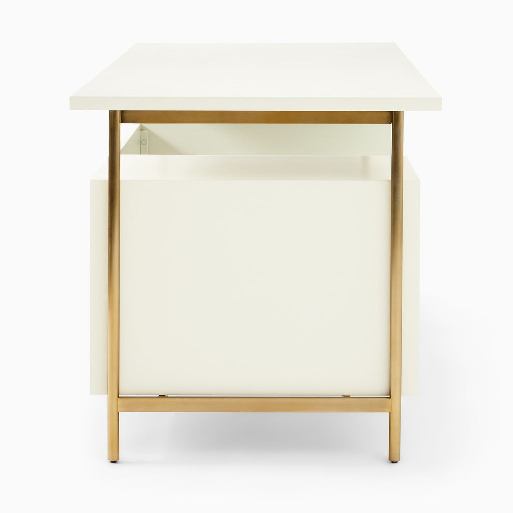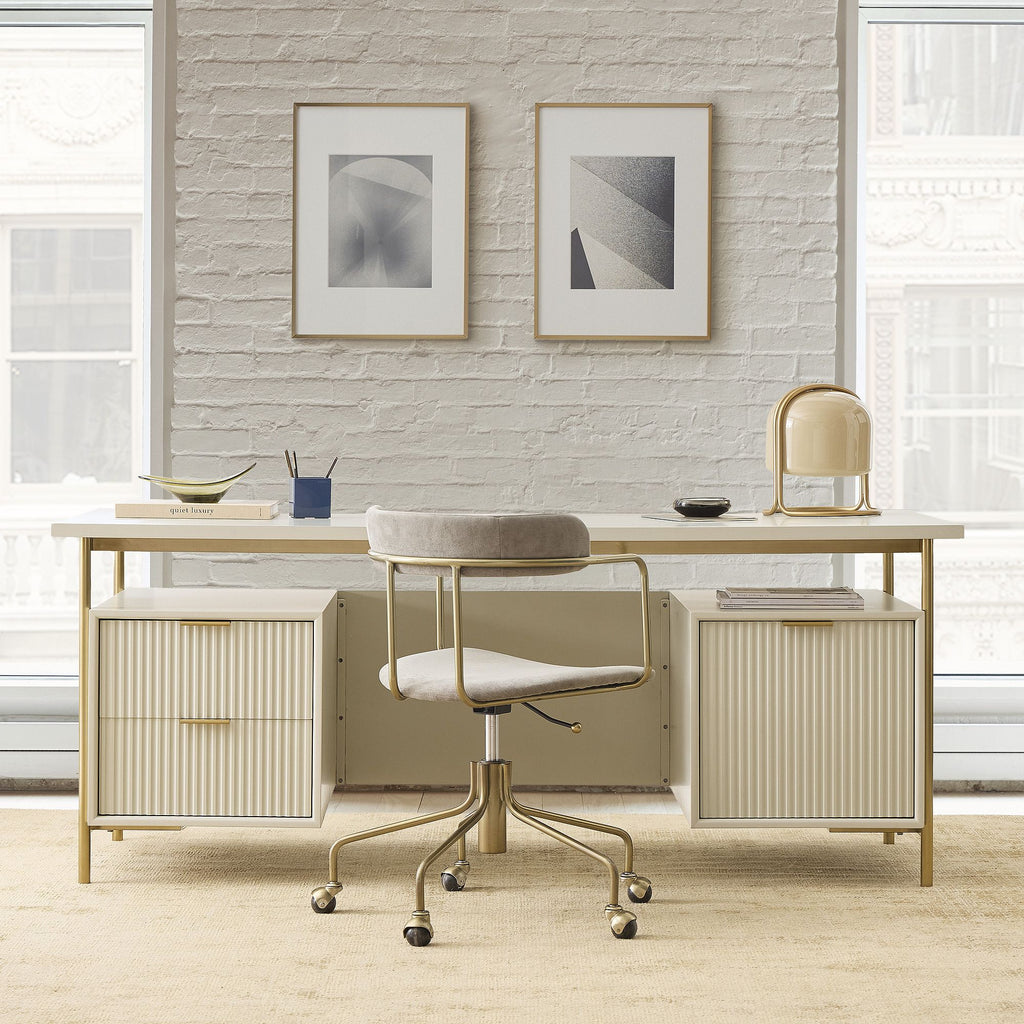 The QUINN EXECUTIVE DESK combines form and function with its striking Art Deco-inspired design. Featuring a streamlined silhouette that pairs smooth lacquer with fluted wood detailing, this sophisticated workspace commands attention while delivering practical elegance. The generous oversized frame provides ample surface area for spreading out projects, files, and essentials without compromise. Built to contract-grade standards, it's engineered for durability and longevity. Slim metal hardware and bright finishes complete the refined aesthetic, making this executive desk a statement piece that elevates any professional environment.